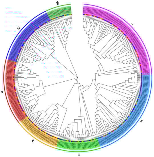 Phylogenetic tree of the SAUR family. The unrooted tree was constructed from all SAUR proteins of Arabidopsis (At), wax gourd (Bh), watermelon (Cla), melon (Cm), and cucumber (Csa). Different color circles represent different species. I–VII represent the seven subfamilies.