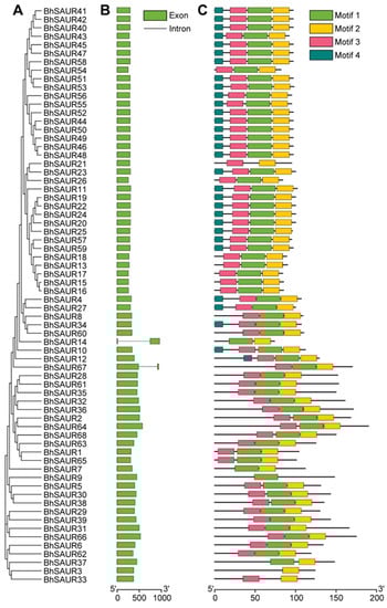Gene structure and conserved motifs of the BhSAUR genes. (A) Phylogenetic tree of the BhSAUR proteins; (B) gene structure of the BhSAUR genes; (C) conserved motifs of the BhSAUR proteins.