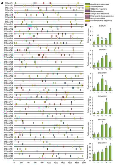 Cis-acting element analysis of the BhSAUR gene promoters. (A) Cis-acting elements in the promoters of the BhSAUR genes; (B) expression analysis of the BhSAUR genes under IAA treatment. T1, T2, T3, T4, and T5 represent 0, 10, 30, 60, and 120 min after IAA treatment, respectively. Values are means ± SDs (n = 3). Different lowercase letters indicate significant differences determined by one-way ANOVA with Duncan’s test (p < 0.05).