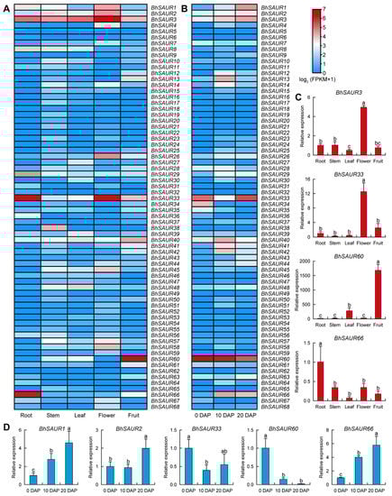 Expression characterization of the BhSAUR genes. (A) Expression profile of the BhSAUR genes in different tissues; (B) expression profile of the BhSAUR genes in fruits at different developmental stages. DAP, days after pollination; (C) validation of the expression of some BhSAUR genes in different tissues. Values are means ± SDs (n = 3); (D) validation of the expression of some BhSAUR genes in fruits at different developmental stages. Values are means ± SDs (n = 3). Different lowercase letters in (C,D) indicate significant differences determined by one-way ANOVA with Duncan’s test (p < 0.05).