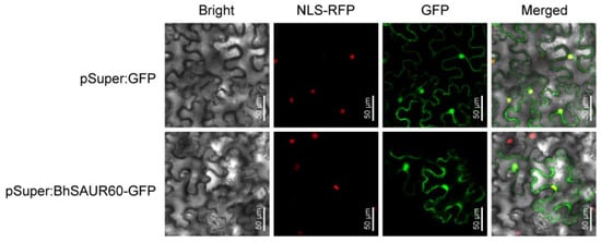 To determine the subcellular localization of BhSAUR60 protein, the green fluorescent protein (GFP) tag was fused to the C terminus of BhSAUR60 under the control of the super promoter. The control construct and Super:BhSAUR60–GFP recombinant construct were transferred into Nicotiana benthamiana leaves using Agrobacterium tumefaciens-mediated transient expression. The result showed that the BhSAUR60–GFP fusion protein was localized to both the nucleus and cytoplasm (Figure 7).