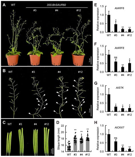 Overexpression of the BhSAUR60 gene in Arabidopsis. (A) Whole-plant phenotypes of wild-type (WT) and 35S:BhSAUR60 plants around 10 days after bolting (DAB); (B) main-stem phenotypes of WT and 35S:BhSAUR60 plants at 18 DAB. Triangles indicate unfertilized pistils; (C) mature siliques of WT and 35S:BhSAUR60 plants; (D) silique lengths of WT and 35S:BhSAUR60 plants. Values are means ± SDs (n = 30), **, p < 0.01 (Student’s t-test); (E–H) expression analysis of fruit development-related genes in WT and 35S:BhSAUR60 siliques. Values are means ± SDs (n = 3), ns, not significant, *, p < 0.05, **, p < 0.01 (Student’s t-test).