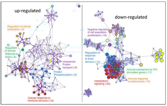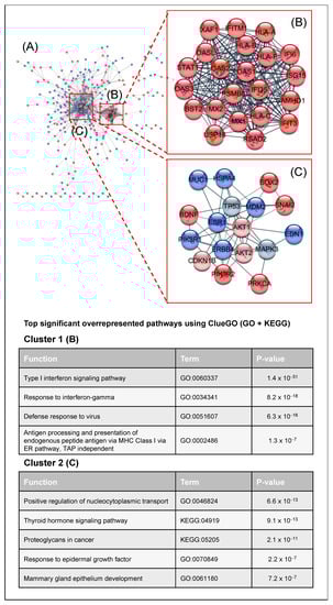 - Bindea, G.; Mlecnik, B.; Hackl, H.; Charoentong, P.; Tosolini, M.; Kirilovsky, A.; Fridman, W.H.; Pagès, F.; Trajanoski, Z.; Galon, J. ClueGO: A Cytoscape Plug-in to Decipher Functionally Grouped Gene Ontology and Pathway Annotation Networks. Bioinformatics 2009, 25, 1091–1093. [Google Scholar] [CrossRef]