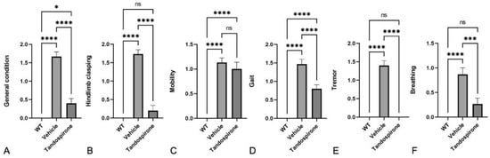 To analyze the effect of tandospirone treatment on the pathological phenotype of Rett syndrome, the “Score test” was evaluated in Mecp2-KO mice according to a previous report adopted in the study of the Mecp2 null mouse model [,]. In detail, the pharmacological treatment started at 4 weeks of age. After 4 weeks of treatment, neurological defects in Mecp2-KO mice were scored (blind to the experimenter and treatment), focusing on general condition, hindlimb clasping, tremor, breathing, mobility and gait. Each symptom was scored from 0 to 2; 0 corresponds to the symptom being absent or the same as in the WT mouse, 1 corresponds to the symptom being present and 2 corresponds to the symptom being severe.
