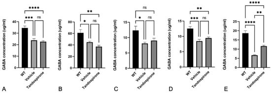 Effect of tandospirone treatment on GABA concentration in the cortex (A), midbrain (B), hippocampus (C), cerebellum (D) and brainstem (E). Mecp2-KO mice showed a significantly decreased GABA concentration in all brain regions, but administration of tandospirone only significantly increased GABA concentration in the brainstem. All values are expressed as the means ± SEMs. Statistical analysis was performed using one-way analysis of variance (ANOVA) with Tukey’s multiple comparison post hoc test for intergroup comparisons. n = 6, * p < 0.05, ** p < 0.01, *** p < 0.001, **** p < 0.0001, ns: not significant.