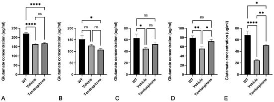 Effect of tandospirone treatment on glutamate concentration in the cortex (A), midbrain (B), hippocampus (C), cerebellum (D) and brainstem (E). Mecp2-KO mice showed a significantly decreased glutamate concentration in the cortex, hippocampus, cerebellum and brainstem when compared with WT mice. Administration of tandospirone significantly increased the lower glutamate concentration in the cerebellum and brainstem but no significant changes in the cortex, midbrain or hippocampus were observed. All values are expressed as the means ± SEMs. Statistical analysis was performed using one-way analysis of variance (ANOVA) with Tukey’s multiple comparison post hoc test for intergroup comparisons. n = 6, * p < 0.05, ** p < 0.01, **** p < 0.0001, ns: not significant.