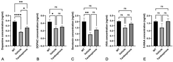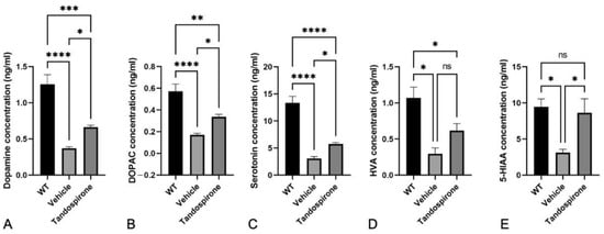 It is known that Mecp2 deficit impairs neurotransmitter systems that correspond with neurological phenotypes observed in both Rett patients and Mecp2-KO mice [,]. Therefore, in this study, we used an HPLC system to investigate the effect of tandospirone treatment on glutamate, GABA, monoamines and their metabolites in the brains of Mecp2-KO mice by HPLC system. The data showed that both the GABA concentration (Figure 2) and glutamate concentration (Figure 3) were significantly decreased in all brain regions of Mecp2-KO mice compared with WT littermates. Tandospirone treatment significantly improved the GABA concentration in the brainstem of Mecp2-KO mice compared to vehicle (Figure 2E, p < 0.01), but the differences were not significant in the other brain regions. The glutamate concentration was also significantly increased in the cerebellum and brainstem of Mecp2-KO mice when compared with vehicle (Figure 3D,E, respectively; p < 0.05). These results suggest that tandospirone treatment may partially improve the deficits of glutaminergic and GABAergic neurotransmission observed in Mecp2-KO mice. In addition, we also confirmed the effect of tandospirone treatment on monoaminergic neurotransmission in the brains of Mecp2-KO mice, focusing on the dopaminergic and serotoninergic systems. The results indicated that Mecp2-KO mice showed a significantly lower concentration of dopamine and its metabolites in the midbrain (Supplementary Figure S3A,B, p < 0.05), cerebellum (Figure 4A,B, p < 0.05) and brainstem (Figure 5A,B, p < 0.001) than WT littermates, but the differences were not significant in the cortex (Supplementary Figure S2A,B, p > 0.05) or hippocampus (Supplementary Figure S4A,B, p > 0.05). Tandospirone treatment significantly enhanced the dopamine concentrations of Mecp2-KO mice in the cerebellum and brainstem compared to vehicle (Figure 4A and Figure 5A, respectively; p < 0.05). The DOPAC concentration in the brainstem was also significantly increased by tandospirone treatment (Figure 5B; p < 0.05). These results suggest that tandospirone treatment significantly improves the dopaminergic neurotransmission deficits in the cerebellum and brainstem seen in Mecp2-KO mice. The serotonin concentration of Mecp2-KO mice was significantly decreased in all brain regions when compared with WT (Supplementary Figures S2C, S3C, S4C, Figure 4C and Figure 5C, p < 0.05). The metabolites HVA and 5-HIAA were significantly reduced in the cortex, midbrain and brainstem (Supplementary Figures S2D,E and S3D, Figure 5D,E, respectively; p < 0.05). Tandospirone treatment also had a tendency to increase the low contents of serotonin and its metabolites observed in Mecp2-KO mice in different brain regions, compared to vehicle but the increase was only significant in the brainstem (Figure 5C,E, respectively; p < 0.05), suggesting that tandospirone treatment might ameliorate the impairment of serotoninergic neurotransmission in the brainstem observed in Mecp2-KO mice.