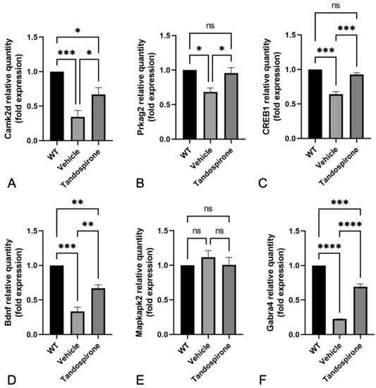 Gene expression in the midbrain by quantitative PCR. Expression changes in CAMK2D (A), PRKAG2 (B), CREB1 (C), BDNF (D), MAPKAPK2 (E) and GABRA4 (F) in WT, vehicle-treated and tandospirone-treated Mecp2-KO mice. All values are expressed as the means ± SEMs. Statistical analysis was performed using one-way analysis of variance (ANOVA) with Tukey’s multiple comparison post hoc test for intergroup comparisons. n = 4, * p < 0.05, ** p < 0.01, *** p < 0.001, **** p < 0.0001, ns: not significant.
