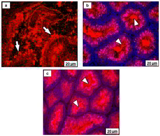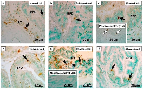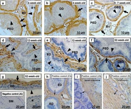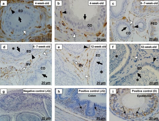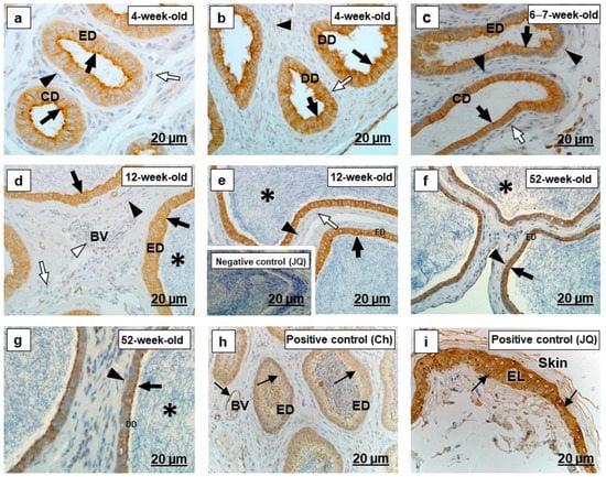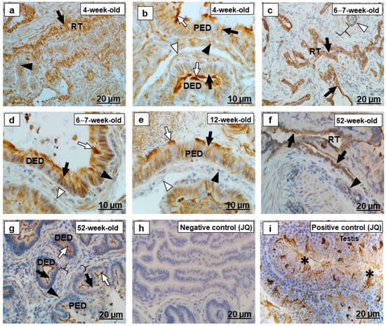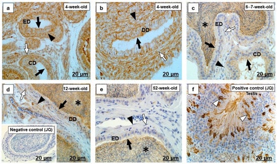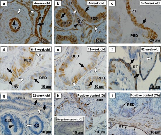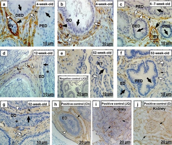 Ibrahim, M.I.A.; Williams, J.H.; Botha, C.J. Immunohistochemical Changes in the Testicular Excurrent Duct System of Healthy, Male Japanese Quail (Coturnix coturnix japonica) Observed at 4, 6–7, 12, and 52 Weeks of Age. Int. J. Mol. Sci. 2022, 23, 14028. https://doi.org/10.3390/ijms232214028
