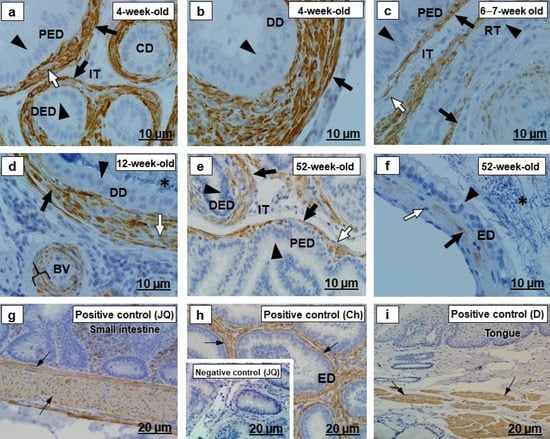 - Madekurozwa, M.C. Post-hatch Changes in the Immunoexpression of Desmin, Smooth Muscle Actin and Vimentin in the Testicular Capsule and Interstitial Tissue of the Japanese quail (Coturnix coturnix japonica). Anat. Histol. Embryol. 2013, 42, 369–378. [Google Scholar] [CrossRef] [PubMed]