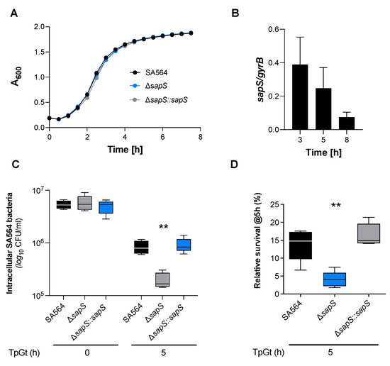 SapS has no impact on S. aureus SA564 growth in vitro but contributes to intramacrophage survival. (A) Growth kinetics of S. aureus strains SA564 (black symbols), SA564 ΔsapS (blue symbols), and SA564 ΔsapS::sapS (grey symbols) in TSB. Cells were cultured at 37 °C and 150 rpm in 96-well plates using a Spark 20M (Tecan, Trading AG, Männedorf, Switzerland) microplate reader. Data represent the mean A600 readings ± SD at the time points indicated (n = 3; error bars are too small to be visible). (B) Transcription of sapS during growth in TSB. Cells of SA564 were cultured at 37 °C and 225 rpm in a culture to flask volume of 1:10, and after 3 h, 5 h, and 8 h of growth, cells were harvested, total RNAs isolated, and qRT-PCRs performed for sapS. Transcripts were quantified in reference to gyrase B mRNA. Data are presented as mean + SD of five biological replicates. (C,D) Survival of S. aureus strain derivatives in infected RAW 264.7 macrophages. CFU rates recovered from infected cells lysates at the time points indicated. Data are presented as mean + SD (n = 5 biological replicates) (C) and survival rates expressed in relationship to the intracellular bacterial cell counts that were detected immediately after the gentamicin/lysostaphin treatment (T0), which was set to 100%. The data are displayed as box and whisker plots, displaying the median (horizontal line), interquartile range (25–75% box), and standard deviation (bars) of five different experiments (D). **, p < 0.01 (Kruskal–Wallis test followed by Dunn’s post-hoc test). TpGt, time post gentamicin treatment.