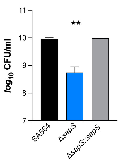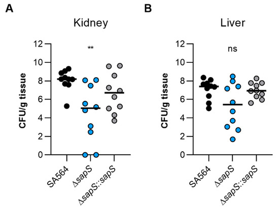 To test the impact of SapS in a mammalian model, we next utilised the S. aureus-based liver and kidney abscess model [34]. Once bacteria were injected into the circulating blood of the mice, and bacterial loads in the liver and kidneys were calculated at four days post infection, a significant decrease in viable bacteria was noticed in the kidneys of mice infected with the ΔsapS mutant (Figure 4A). Kidney homogenates of SA564 ΔsapS challenged mice contained in the median more than 2 log10 fewer colony forming units (CFU) than kidney homogenates of SA564 infected mice. CFU rates in kidney homogenates of SA564 ΔsapS::sapS challenged mice were about 1.5 log10 higher as those seen with SA564 ΔsapS challenged mice, and did not differ statistically from the CFU rates seen in the kidney homogenates of wild-type infected mice. Mice infected with the ΔsapS mutant also displayed in the median about 2 log10 fewer CFU numbers in the liver than wild-type or ΔsapS::sapS challenged mice (Figure 4B), despite the fact that this difference was not significantly different according to the statistics (p = 0.1873, Kruskal–Wallis test and Dunn’s post-hoc test). Both infection models suggest that SapS is a factor that favorably affects the infectious potential of S. aureus under in vivo conditions, and that SapS is of particular importance for the bacterium to form abscesses in kidneys.
