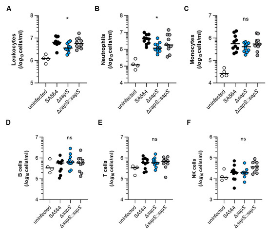 The impact of SapS on the immune cell composition observed in the blood of mice infected with S. aureus. C57BL/6N mice were infected with S. aureus strain SA564 (black symbols), SA564 ΔsapS (blue symbols), and the cis-complemented derivative SA564 ΔsapS::sapS (grey symbols), respectively (n = 10 per group). After 4 days of infection, blood was withdrawn from narcotized mice, red blood cells lysed, the residual blood cells stained with fluorochrome-conjugated antibodies and the cell contents of leukocytes (A), neutrophils (B), monocytes (C), B cells (D), T cells (E), and NK cells (F) determined by flow cytometry. Blood from age-matched uninfected mice served as control (white symbols). Each symbol represents the cell content obtained from the blood of an individual mouse. The median of all the observations is shown by the horizontal bar. ns, not significant; * p < 0.05 (Kruskal–Wallis test followed by Dunn’s post hoc test. Only significant differences between WT-infected and mutant-infected mice are shown).