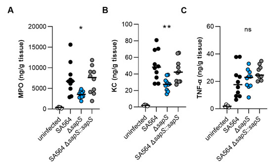 To test whether the increased numbers of neutrophils seen in the blood of SA564 infected mice were also accompanied by increased numbers of this immune cell type at the infection side, we next tested the myeloperoxidase (MPO) contents in kidney tissue homogenates obtained from the infected mice at four days post infection. In accordance with the increased numbers of neutrophils in blood of WT and ΔsapS::sapS infected mice, we observed in the median twice as high MPO levels as in kidney tissue homogenates obtained from ΔsapS infected mice (Figure 6A). Similarly, significantly lower levels of the neutrophil chemoattractant chemokine KC were observed in kidney tissue homogenates of the ΔsapS-infected mice in contrast to mice that had been infected with wild-type S. aureus (Figure 6B), while concentrations of the pro-inflammatory cytokine TNF-α were on a comparable level in all three groups (Figure 6C). Notably, when compared to the MPO, KC, and TNF-α contents observed in kidney tissue homogenates of age-matched uninfected mice, MPO and KC levels in kidney homogenates of mice infected with a SA564 derivative harbouring a functional sapS were both significantly increased. MPO and KC levels in kidney tissue homogenates of ΔsapS-infected mice, on the other hand, did not differ statistically from the MPO and KC contents observed in kidney tissue homogenates of age-matched uninfected mice (p ≥ 0.1630, Kruskal–Wallis test and Dunn’s post hoc test). These data seem to indicate that S. aureus cells harbouring a functional sapS, which form abscesses in kidneys, induce a chemokine response that favours the recruitment of neutrophils to the infection site.