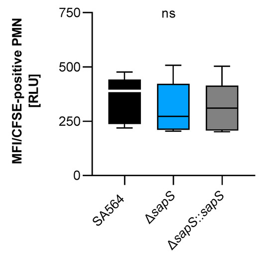 Impact of SapS on the phagocytosis of S.aureus strain SA564 by polymorphonuclear leukocytes (PMNs). The cells of S. aureus were labeled with carboxyfluorescein diacetate succinimidyl ester (CFSE) and mixed to lithium heparin-anticoagulated fresh human blood at a multiplicity of infection of 50 per PMN, and maintained at 37 °C and 1000 rpm. Using flow cytometry, as described in the Material and Methods section, the adhesion and ingestion of bacteria by PMNs was examined. The data show three biological replicates that were performed in triplicate. Data are presented as box and whisker plots showing the interquartile range (25–75%; box), median (horizontal line), and whiskers (bars; min/max). ns, not significant (Kruskal–Wallis test followed by Dunn’s post hoc test).