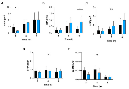 The effect of deleting the sapS gene in S. aureus on the transcription of genes that code for enzymes involved in the detoxification of reactive oxygen species (ROS). qRT-PCR was used to conduct quantitative transcript analyses of ahpC (A), katA (B), crtM (C), sodA (D) and sodM (E) in SA564 (black bars) and SA564 ΔsapS (blue bars) cells cultured in TSB at 37 °C and 225 rpm at the time points indicated. Quantification of the transcripts was performed in relation to the transcription of gyrase B (in copies per copy of gyrB). The data are shown as mean + SD of five biological replicates. ns, not significant; * p < 0.05 (Mann-Whitney U test between WT and mutant at a given time point).