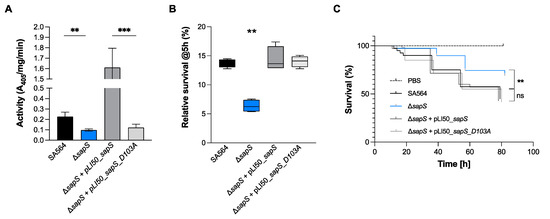 Infected zebrafish embryos display an increased level of survival when infected with the SA564 ΔsapS mutant. Kaplan–Meier graphic represents the survival of infected zebrafish embryos after injection in the duct of Cuvier with SA564 (black symbols), SA564 ΔsapS (blue symbols), and SA564 ΔsapS::sapS (grey symbols) strains at 3 × 102 CFU/nL grown in exponential phase, or PBS (negative control) The proportion of surviving embryos (n = 50 for each, indicative of three different experiments) is represented. **, p < 0.01, ns, not significant (Log-rank Mantel–Cox statistical test). hpi, hours post-infection.