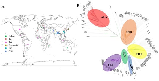 Population structure in O. sativa. (A) The large pie chart summarizes the distribution of subpopulations in the 230 O. sativa samples in our diversity panel, and the smaller pie charts on the world map correspond to the country-specific distribution of subpopulations sampled. (B) Phylogenetic tree of 230 accessions from the RDP1 in this study. ADM = admixture; ARO = aromatic; AUS = aus; IND = indica; TEJ = temperate japonica; TRJ = tropic japonica.