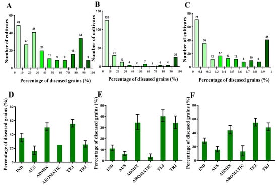 Phenotypic distribution of the 230 cultivars’ panicle blast resistance: (A–C) Diseased grains rate of the 230 cultivars by inoculating isolate 2014-290B27 in 2017, 2018, and 2019 in Nanjing, respectively. (D–F) Distribution of average diseased grains of the population in the six sub-populations.