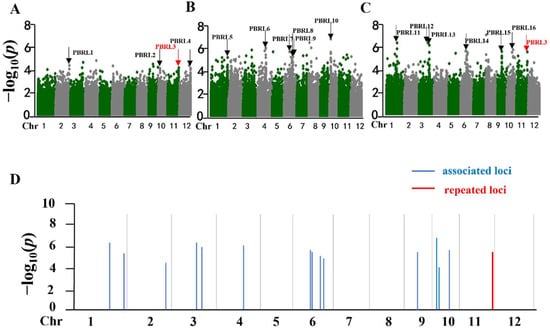 GWAS of the 230 cultivars’ inoculation and the distribution of rice-blast-associated loci. (A–C) Manhattan plots for panicle blast resistance in 2017, 2018, and 2019, respectively. The x-axis shows the single-nucleotide polymorphisms (SNPs) along each chromosome; the y-axis is the −log 10 P for the association. The red arrows indicate the significant SNPs above the threshold, and the black arrows indicate the panicle blast resistance loci. (D) Summary of the identified loci of panicle blast. Each bar represents an associated locus. Blue and red lines indicate the associated loci and repeated loci, respectively.