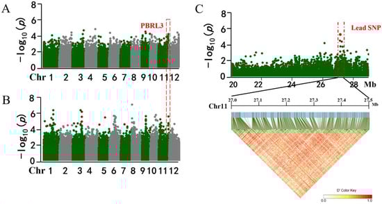 GWAS for leaf blast by inoculating the isolate 2014-290-B27 and LD block analysis for the peak on chromosome 11. (A,B) Manhattan plots from GWAS for rice blast resistance in June 2017 and 2019. The genomic coordinates are displayed along the x-axis and the logarithm of the odds (LOD) score for SNP is displayed on the y-axis. Different colored dots represent significant SNP obtained in different years. The red dashed box indicates the repeat site PBRL3. (C) Local Manhattan plot (top) and LD heatmap (bottom) surrounding the peak on chromosome 11. The red dot indicates the lead SNP at PBRL3.