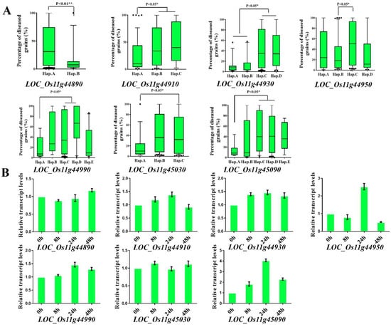 The Rice Diversity Panel (RDP-1) contains substantial genetic and phenotypic diversity and has been used for GWAS analysis of various traits in rice []. We selected 230 cultivars in RDP-1 for panicle blast resistance identification in the field. Three experimental field panicle blast inoculations were performed on these cultivars. The average diseased grains percentages were 23.33%, 12.53%, 50.37%, and 38.70% in IND, AUS, TEJ, and TRJ, respectively. These results are consistent with previous studies where the TRJ and IND subgroups of rice were more resistant than the TEJ subgroups []. We chose the EMMAX model for association analysis and identified a repetitively mapped locus PBRL3 within the Pik locus at the end of chromosome 11. Haplotype analysis and expression pattern analysis identified 5 candidate genes that were significantly induced by M. oryzae. Among them, LOC_Os11g44910 encodes a DEAD-box RNA helicase, which contains a conserved amino acid sequence Asp-Glu-Ala-Asp (DEAD). DEAD box RNA helicase family proteins can hydrolyze ATP to obtain double-stranded energy unwinding RNA, and are reported to be involved in plant leaf growth and the cold stress response [,]. LOC_Os11g44930 encodes a pentatricopeptide-repeat (PPR)-domain-containing protein. Plant PPR proteins are usually located in mitochondria or chloroplasts, which edit and modify the RNA transcripts to regulate plant growth and development [,]. LOC_Os11g44950 is a member of the glycosyl hydrolase family 3. Glycosyl hydrolase can effectively hydrolyze sugar-based substances and are involved in cell wall remodeling []. LOC_Os11g44990 and LOC_Os11g45090 are NBS-LRR-type genes that are widely reported to be involved in rice blast resistance []. Furthermore, after inoculation with M. oryzae, the expression of LOC_Os11g45090 significantly increased at 24 h by 4.07-fold. These results indicate that LOC_Os11g45090 (Pb3) is the most likely candidate gene in PBRL3.