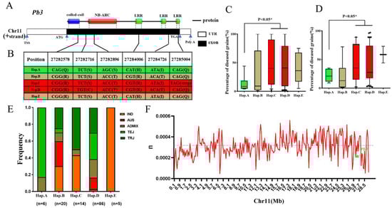 The haplotype of Pb3 in the natural 230 population of RDP-1. (A) Gene structure of the candidate gene Pb3 (bottom) and conserved domain in Pb3 (top). The blue, red, and green boxes represent different domains of PB3, respectively. The grey boxes represent the coding sequence of Pb3. (B) Haplotype analysis of the Pb3 gene region based on the polymorphic sites shown in (A). (C,D) The distribution of phenotypes corresponding to different haplotypes in 2017 and 2019. (E) Frequency distribution of the five subpopulations in the five haplotypes of Pb3. (F) Nucleotide diversity of chromosome 11. The Pb3 locus is indicated by a green arrow.