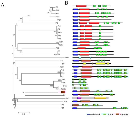 To clarify the Pb3 genetic differentiation of the natural population, the PLINK online script was used to extract SNPs on chromosome 11 in natural populations []. Then, nucleotide diversity (π) was calculated using VCFtools software []. Sliding 100 kb windows were used during the calculation with a 10 kb sliding step. The multiple sequences of R genes were aligned with MEGA7, then the phylogenetic trees were calculated and constructed using the neighbor-joining method within 1000 replicates. The conserved domain of the R gene was predicted by the Pfam online website (http://pfam.xfam.org/, accessed on 25 November 2021), and the gene structure was drawn by the IBS1.0.3 software [].