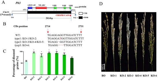 The Phenotype of CRISPR lines of Pb3. (A) Schematic presentation of the gene structure of Pb3 and CRISPR/CAS9 mutation sites. (B) Mutations in the three knockout lines of Pb3 in the Bodao background. The red arrow indicates the position of the CDs of Pb3. The bases marked red represent the inserted sequence in the genome. The red line indicates the missing sequence on the genome. (C) Percentage of diseased grains of the wild-type Bodao and three mutant lines. Different lines are distinguished by different colors. Each material is inoculated with 9 panicles. (D) Injection inoculation at the booting stage of the six mutants and wild-type plants using strain 2015-248A3. BO: Bodao. * p < 0.05.