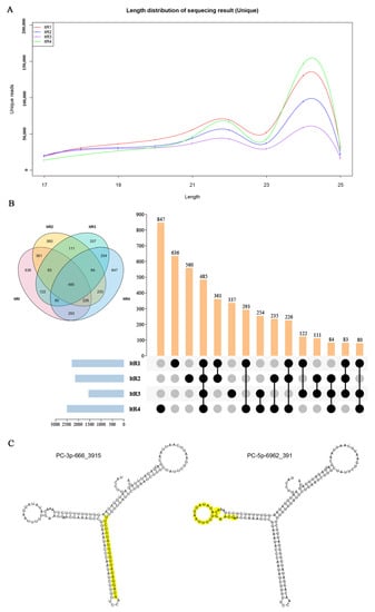 Overview of four sRNA Libraries. (A) The length distribution of small RNAs in the four libraries. (B) Venn diagram of the number of miRNAs expressed in the four sRNA libraries. “Blue columns” represent the total number of miRNAs in each library; “orange columns” represent the number of miRNAs expressed in different libraries; “black dots” represent that the miRNAs could be expressed in the library listed in the left and “grey dots” represent that the miRNAs could not be expressed in the library listed in the left. (C) The secondary structure of two miRNAs derived from different arms of the same precursor. Sequences marked in yellow represented mature miRNA.