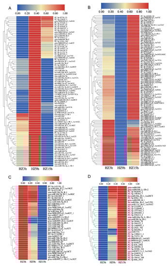 Level of expression of miRNAs in response to C. lunata in the susceptible variety HZ at different inoculation time points (3, 9 and 15 hpi). The expression trends were divided into four categories: first increase and then decrease (A), first decrease and then increase (B), reduced expression (C) and increased expression (D).