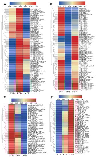 In addition, a total of 72 miRNA families were identified through miRNA family analysis, of which miR159, miR166 and miR156 were the most abundant. We found that members of the same miRNA family always showed similar expression trends through microarray analysis, which was consistent with reports published previously []. For example, the expression of some members of miR159, miR166 and miR6300 showed the trend of “first increase and then decrease” (ID), and some of miR5368 showed “first decrease and then increase” (DI) in HZ. In LY, the expression trend of some members of miR159 was “ID”. Meanwhile, some miRNA families, for example miR156, miR160 and miR166, shared conserved sequences and target genes, which was also discovered in other plants, from ferns to flowering plants [,]. The family miR-482/2118 showed special regulatory effects on NBS-LRR, defense genes during pathogen infection in plants [,]. The targets of miR164 were the transcript factor family NAC playing important roles in disease and stress resistance, growth and development [,,].