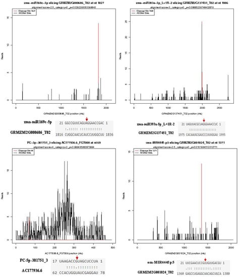 To search the targets of identified miRNAs, two independent degradome libraries of susceptible variety HZ and resistant variety LY were constructed and high-throughput sequenced. A total of 11,473,928 and 13,961,496 clean reads were obtained in the HZ and LY degradome libraries, respectively, of which 9,517,279 (82.62%) and 11,676,151 (83.33%) matched to the maize transcriptome (Table 2). Through TargetFinder, a total of 13,026 mRNAs were predicted to be targeted by 1013 miRNAs (Table S11). Among these miRNAs, 665 miRNAs were corroborated to cleave 1584 targets sequenced in the degradome (Table S12). The cleavage sites for some miRNA–mRNA alignments are shown in Figure 4. The cleavage sites of most miRNAs were between 10 and 11 of the targets. Unfortunately, the target genes of some identified miRNAs, especially novel ones, could not be detected in the present degradome libraries. For example, PC-3p-104754_19, PC-3p-73272_34, PC-3p-1280411_1 and PC-3p-130200_14, were predicted to cleave 25, 13, 11, 6 targets, respectively, but no targeted mRNAs were found in degradome libraries.