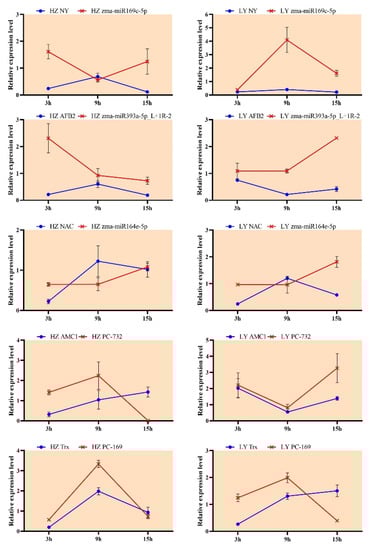 At 15 hpi, the miRNA zma-miR169 was expressed up-regulated and the expression of its target mRNA NY was down-regulated in the susceptible variety HZ; at 3 hpi, the expression of zma-miR393 was up-regulated, while the expression of AFB2 was down-regulated in HZ; at 15 hpi, the miRNA zma-miR164 negatively regulated the expression of NAC in the resistant variety LY (Figure 6). Similarly, the negative regulation could also be observed from PC-732 (PC-3p-73272_34)/AMC1 at 9 hpi in HZ and from PC-169 (PC-3p-169098_11)/Trx at 15 hpi in LY. The results showed that the expression pattern of miRNAs and their corresponding target genes were negative relationship.