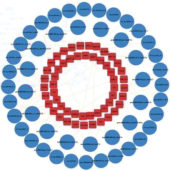 An interaction network indicating the relationship between miRNAs associated with the disease resistance of maize to C. lunata and their corresponding target genes. The blue circles represent the miRNAs and red rectangles represent the target genes. The characters in the red rectangles stand for the abbreviation of target genes showing in Table S13.