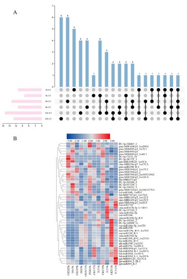 The characteristics of miRNAs identified to be related to disease resistant of maize to C. lunata. (A) Venn diagram of the number of miRNAs expressed differentially at different inoculation times in the susceptible variety HZ and the resistant variety LY. The “black dots” represent that the miRNAs could be expressed at the inoculation time point listed in the left and “grey dots” represent that the miRNAs could not be expressed at the inoculation time point listed in the left. (B) The expression dynamics of miRNAs involved in the disease resistant response of maize.