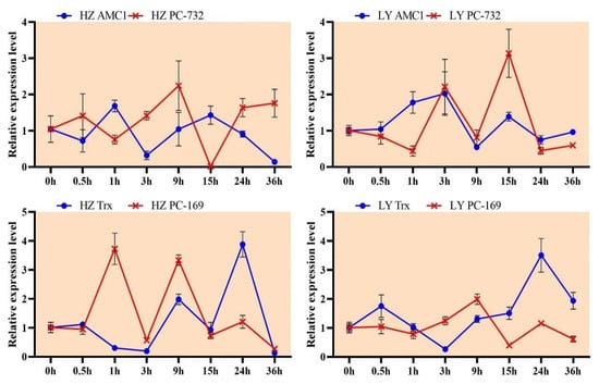 The expression profiles of two novel miRNAs (PC-732 and PC-169) and their corresponding targets (AMC1 and Trx) were further investigated, and the HZ and LY samples were collected at 0, 0.5, 1, 3, 9, 15, 24 and 36 hpi. In the resistant variety LY, the expression of PC-732 and AMC1 showed negative correlation at the early inoculation stage (0–1 hpi): the expression of PC-732 was down-regulated, and AMC1 was up-regulated (Figure 9), indicating that AMC1 might take part in the regulation of early stage of disease resistance. However, in the susceptible variety HZ, the negative correlation mode between PC-732 and AMC1 was not obvious, speculating that PC-732 might not regulate the expression of AMC1 in HZ (Figure 9).
