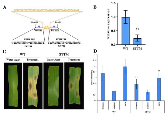 To further confirm the role of PC-732 in the interaction of maize and C. lunata, transgenic plants in which the PC-732 was silenced by STTM were generated in maize B104, which is susceptible to C. lunata (Figure 10A) []. Stem-loop RT-PCR showed that the expression of PC-732 was suppressed in the transgenic plants (STTM) (Figure 10B). The wildtype (WT) and transgenic plants (STTM) were inoculated by C. lunata, and we found that the lesion area of necrosis showed no difference between STTM and WT, however, the lesion area of chlorosis for STTM was significantly smaller than WT and so was the ratio of chlorosis to necrosis (Figure 10C,D). The results indicated that knocking down PC-732 decreased susceptibility of maize to C. lunata, suggesting that PC-732 might inhibit the expression of disease resistance related genes during the interaction between maize and C. lunata.