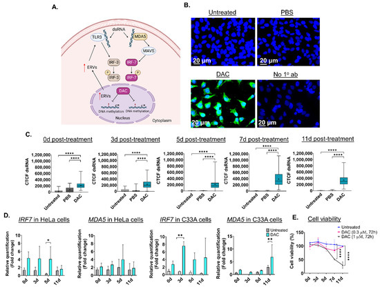 Figure 1. Low dose DAC treatment induces a viral mimicry response in HPV+ cells and HPV− cells in response to DAC treatment. (A) Illustration of the viral mimicry response induced by DAC treatment in cancer cells [20]. Figure created in BioRender [20,21,45]. (B) ICC/IF analysis of dsRNA in response to DAC (1 μΜ, 72 h) in HeLa cells at 11d post-treatment. Blue staining (DAPI) indicates the nucleus, and green fluorescence signal (AlexaFluor® 488) indicates the staining for dsRNA. Untreated and PBS-treated cells were used as controls. Cells incubated without the primary antibody were used as the negative control. (C) Quantification of dsRNA levels in HeLa cells in response to DAC treatment at 0d, 3d, 5d, 7d and 11d was performed by measuring the corrected total cell fluorescence (CTCF) using ImageJ as follows: CTCF = Integrated density − (area of selected cell × mean fluorescence of background readings [20]. Data represent the median with range of CTCF value from 100 cells per treatment condition for each time point. The mean is also indicated by a cross (+). The experiment is a representative repeat of two independent experiments. Statistical analysis was performed using one-way ANOVA with Kruskal–Wallis test (**** p < 0.0001). (D) QPCR analysis of IRF7 and MDA5 gene expression levels in response to DAC treatment (0.3 μΜ, 72 h) at the indicated time points in HeLa cells and C33A cells. For all qPCR analysis, normalization to the mRNA levels of the housekeeping GAPDH was conducted. Relative quantification to the vehicle control (PBS-treatment) was performed. The fold change (2−ΔΔCt) was calculated and plotted showing the mean ± SD. The data presented are a representative repeat of two independent experiments. Statistical analysis was performed using two-way ANOVA with Tukey’s multiple comparisons test (* p < 0.05, ** p < 0.01). (E) Cell viability of HeLa cells in response to DAC treatment (1 μΜ, 0.3 μM), for 72 h at 0d, 3d, 5d, 7d and 11d post-treatment using an MTT assay. The data are a representative repeat of three independent experiments. The data are plotted as the mean ± SD. Statistical analysis was conducted using two-way ANOVA with Tukey’s multiple comparisons test (**** p < 0.0001).