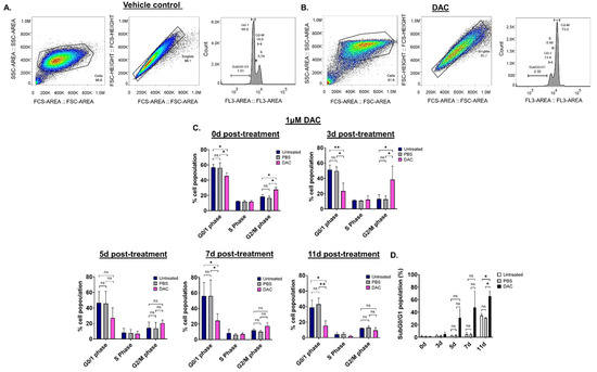 To assess whether DAC treatment results in any changes in the cell cycle of CC cells, cell cycle distribution analysis was performed using flow cytometry. Since the effects of DAC treatment were similar in all cell lines used, cell cycle analysis was performed in HeLa cells. HeLa cells were treated with 1 μΜ of DAC for 72 h, and cell cycle distribution was assessed at 0d, 3d, 5d, 7d and 11d post-treatment. The nucleus of untreated, PBS-treated (vehicle control) and DAC-treated cells was stained with propidium iodide (PI). Appropriate gating was conducted, and the cell cycle phases were identified and annotated (Figure 2A,B). Our data showed that DAC treatment resulted in changes in the cell cycle distribution partly characterized by accumulation of cells at the G2/M phase in a time-dependent manner (Figure 2C). In particular, cell cycle arrest at the G2/M phase was noted at 0d and 3d post-treatment in response to DAC treatment at 1 μM with the greatest increase in cell population at the G2/M phase observed at 3d post-treatment (3-fold) compared to the vehicle control (Figure 2A–C). Simultaneously, the cells at the G0/1 phase remained low at all times (3d, 5d, 7d, 11d) compared to untreated and the vehicle-treated cells (Figure 2C). Following the cell cycle arrest, most of the DAC-treated cells ended up in the SubG0/G1 phase at 5d, 7d and 11d post-treatment, indicating that the cells may undergo apoptosis (Figure 2D).