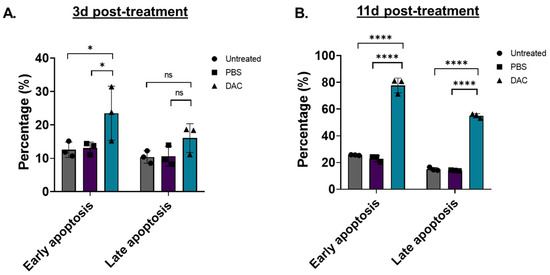To assess whether DAC-mediated induction of cell viability is associated with cell apoptosis, as suggested by cell cycle analysis, flow cytometry was performed (Figure 3). Two different time points were tested, an early time point at 3d post-treatment and a late time point at 11d post-treatment. To distinguish between early and late apoptosis, HeLa cells were stained with Annexin-V and 7-AAD, respectively, as previously described [46,47,48]. We found that DAC treatment induced a higher number of early and late apoptotic cells at 3d post-treatment by 1.8-fold (* p = 0.0254) and 1.5-fold (p = 0.2870), respectively, compared to the vehicle control (Figure 3A). A striking effect was observed at 11d post-treatment, where an approximately 3.4-fold and 4-fold increase in early and late apoptotic cells, respectively, was induced in response to DAC treatment compared to the vehicle-control cells (Figure 3B).
