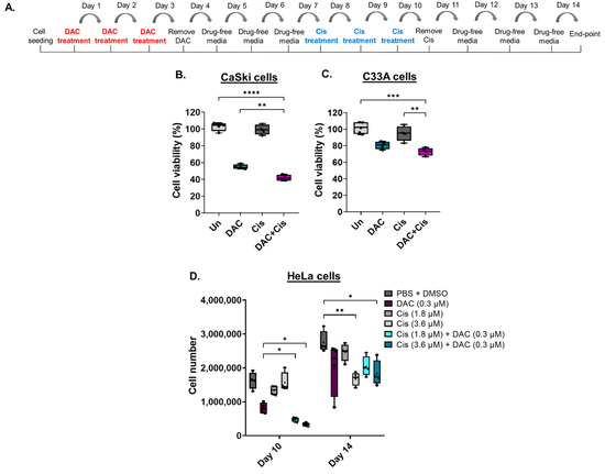 Figure 4. Low-dose DAC treatment sensitizes CC cells to cisplatin. (A) Timeline of DAC treatment (coloured in red) at 0.3 μΜ, 72 h followed by treatment with cisplatin (coloured in blue) at 0.6 μM, 72 h. Cells were harvested at 4 days after cisplatin treatment. Cell viability analysis of CaSki (B) and C33A (C) cells in response to the combination treatment of DAC (0.3 μΜ, 72 h) followed by cisplatin (0.6 μΜ, 72 h). Statistical analysis was performed using one-way ANOVA (Kruskal–Wallis test) (** p < 0.01, *** p < 0.001, **** p < 0.0001). (D) HeLa cells were treated with DAC at 0.3 μΜ, 72 h, followed by cisplatin treatment at 1.8 μΜ or 3.6 μΜ for 72 h. Cell numbers were assessed using a cell counter at the indicated time points of treatment. The following treatment groups were included in the experiment: DAC alone (0.3 μΜ, 72 h); cisplatin alone (1.8 μΜ, 72 h or 3.6 μΜ, 72 h); DAC treatment followed by cisplatin at 1.8 μΜ, 72 h or 3.6 μΜ, 72 h; PBS + DMSO treated cells used as the vehicle control. Cell number of adherent HeLa cells of all treatment conditions were counted at day 10 and day 14, as indicated in the timeline (A). The data presented are a representative repeat of three independent experiments. The data are plotted as the median with range. The mean is also indicated by a cross (+). Statistical analysis was performed using one-way ANOVA (Kruskal–Wallis test) test (* p < 0.05, ** p < 0.01).