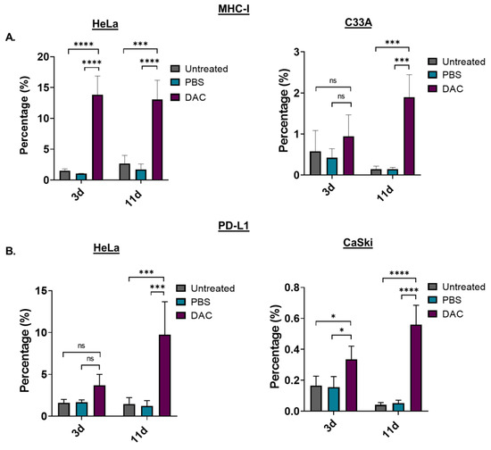 Figure 5. DAC treatment induces MHC-class I and PD-L1 expression on CC cells. (A) Percentage of the MHC-I positive cells in the untreated, PBS-treated and DAC-treated HeLa and C33A cells at 3d and 11d post-treatment. (Β) Cell numbers of PD-L1 positive cells in untreated, PBS-treated and DAC-treated HeLa and CaSki cells at 3d and 11d post-treatment. The cell number was normalized to the counting beads for each condition. The data represent average values from three independent experiments (mean ± SD). Statistical analysis was performed using two-way ANOVA with Tukey’s multiple comparisons test (* p < 0.05, *** p < 0.001, **** p < 0.0001, ns = not statistically significant).