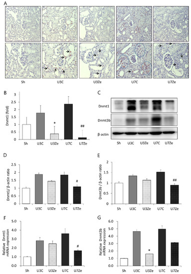 Expression of DNA methyltransferases in obstructed kidneys. (A,B) Representative renal sections stained with DNMT1 (original magnification: upper, ×200; lower, ×400) and quantitative analyses. Arrows and circles indicate positive cells and areas, respectively. (C–E) Western blot and quantitative analyses of DNMT1 and DNMT3b. (F,G) QRT-PCR analysis for DNMT1 and DNMT3b in obstructed kidney tissue after inhibiting DNMT. * p < 0.05 vs. UUO D3 control; # p < 0.05 vs. UUO D7 control; ## p < 0.01 vs. UUO D7 control. Sh, sham-operated group; U3C, UUO at day 3 group; U3Ze, zebularine-treated UUO group at day 3; U7, UUO at day 7 group; U7Ze, zebularine-treated UUO group at day 7.