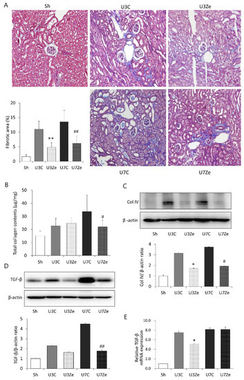 The effect of zebularine on renal tubulointerstitial fibrosis after UUO. (A) Representative renal section stained with Masson’s trichrome (original magnification, ×200) and quantitative analyses of the results of tubulointerstitial fibrosis area. (B) Change in total collagen content after zebularine treatment in obstructive kidneys after UUO. (C,D) Representative immunoblot images showing that renal type IV collagen (Col IV) and TGF-β1 expression decreased in the zebularine group. Density of each protein band was normalized by β-actin of the same sample. (E) TGF-β1 mRNA level was attenuated in obstructed kidneys by zebularine. Expression level of TGF-β1 mRNA in each sample was normalized by the expression level of GAPDH mRNA in the same sample. * p < 0.05 vs. UUO D3 control; ** p < 0.01 vs. UUO D3 control; # p < 0.05 vs. UUO D7 control; ## p < 0.01 vs. UUO D7 control. Sh, sham-operated group; U3C, UUO at day 3 group; U3Ze, zebularine-treated UUO group at day 3; U7, UUO at day 7 group; U7Ze, zebularine-treated UUO group at day 7.