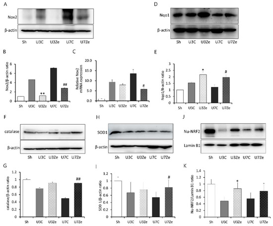 The effect of zebularine on oxidative stress-associated enzymes after UUO. (A–C) Immunoblot analysis and mRNA expression of Nox2 with quantitative analyses. Representative immunoblot image against Nox2 (A) and densitometric result of immunoblot images. Intensities of Nox2 bands were normalized by β-actin in the same sample (B). The expression level of Nox2 mRNA was normalized by GAPDH mRNA in the same sample (C). (D–I) Western blot analysis of Nqo-1 (D,E), catalase (F,G), and SOD1 (H,I). (J) Immunoblot analysis for nuclear Nrf2 (Nu-NRF2) reveals that obstructive injury reduced its expression, but zebularine significantly increased its expression at all time points. (K) Densitometric analysis of immunoblot images against Nu-NRF2. Intensities of Nu-NRF2 bands were normalized by Lamin B1 in the same sample. * p < 0.05 vs. UUO D3 control; ** p < 0.01 vs. UUO D3 control; # p < 0.05 vs. UUO D7 control; ## p < 0.01 vs. UUO D7 control. Sh, sham-operated group; U3C, UUO at day 3 group; U3Ze, zebularine-treated UUO group at day 3; U7, UUO at day 7 group; U7Ze, zebularine-treated UUO group at day 7.