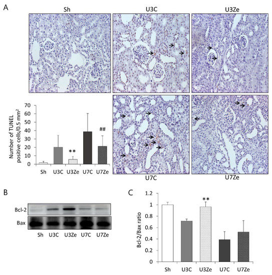 The effect of zebularine on apoptosis after UUO. (A) Representative renal sections stained in the TUNEL assay and quantitative analyses in the obstructed kidneys. Arrows indicate positive cells. (B,C) Immunoblot and quantitative analyses of Bcl-2 and Bax; the ratio of Bcl-2 to Bax expression decreased after UUO but increased in response to zebularine treatment. ** p < 0.01 vs. UUO D3 control; ## p < 0.01 vs. UUO D7 control. Sh, sham-operated group; U3C, UUO at day 3 group; U3Ze, zebularine-treated UUO group at day 3; U7, UUO at day 7 group; U7Ze, zebularine-treated UUO group at day 7.