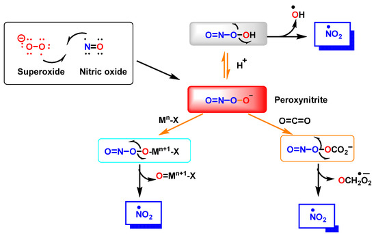 Peroxynitrite ONOO− is produced by a reaction between •NO and •O2−, Figure 3. It is a potent oxidizing and nitrating agent with a relatively short half-life of about 10−2 s [8]. Its byproducts cause a variety of oxidative stress reactions, including lipid peroxidation, enzyme and protein inactivation, and mitochondrial dysfunction. Macrophages and other immune cells rely on the highly reactive chemical ONOO− to clear invading pathogens [9]. Deregulation of ONOO− production has been associated with an increased risk of cardiovascular disease, neurological disorders, and cancer [10]. Secondary reactions of peroxynitrite decomposition are synthesized in Figure 3.