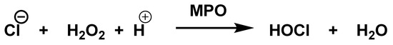 HOCl is formed in biological systems by the enzyme heme myeloperoxidase MPO, which converts H2O2 to HOCl in the presence of chloride ion (Cl−) [44], Figure 18.