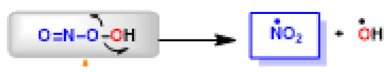 The peroxynitrite ion is stable, but its protonated form (ONOOH, pKa = 6.5 to 6.8) decomposes rapidly through homolysis to a variety of RNS. Its decomposition can form approximately 28% free •NO2 and •OH radicals [35], Figure 11.
